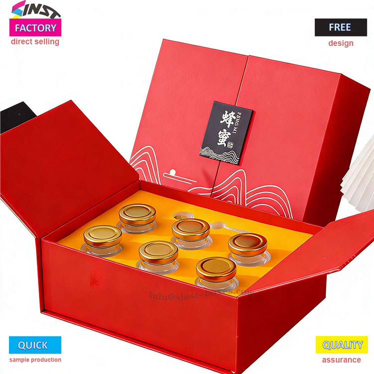 Ta rdeča darilna škatla z medom združuje elegantne valovite vzorce z visokokakovostnim trdim kartonom in ima zložljivo strukturo za enostavno shranjevanje in transport. Darilna škatla za med podpira različne velikosti steklenih kozarcev (za med/tonik) in je opremljena s penastim vložkom po meri za shranjevanje vsebine. Zelo primeren za praznična darila, poslovna darila in embalažo izdelkov za zdravje, skladno z darilnimi preferencami na evropskih, ameriških in trgih jugovzhodne Azije. Ta škatla je lahka, elegantna in stroškovno učinkovita, hkrati pa povečuje vrednost izdelka.