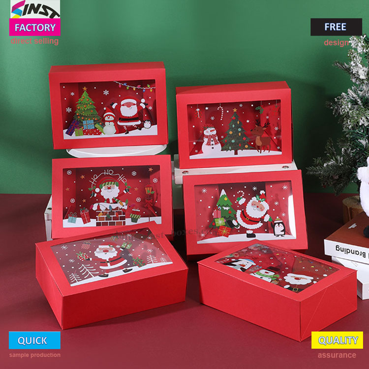 Ta božična škatla za bonbone ima toplo rdeče ozadje, pravokotno ohišje škatle in prozorno okence, kot okno za pogled v zimsko pravljico. Ta božična škatla za bonbone iz trdega papirnatega materiala, ki lahko prikaže bonbone v notranjosti in ima določeno stopnjo stabilnosti. Lahko se prilagodi vsakodnevnim artiklom, kot so čokolada, sladice, piškoti, gumijevi itd.; To ni samo ljubka posoda za sladkarije, ampak tudi namizni božični okras. Če ga daste ljudem za osebno uporabo, lahko polepšate praznično razpoloženje, tako da bo vsaka sladkost ovita v občutek slovesnosti.