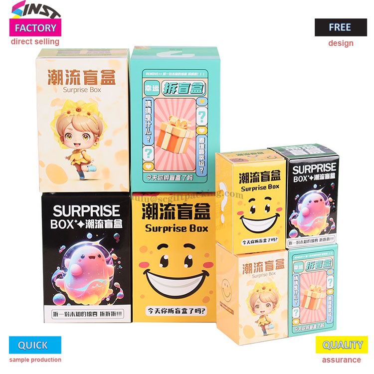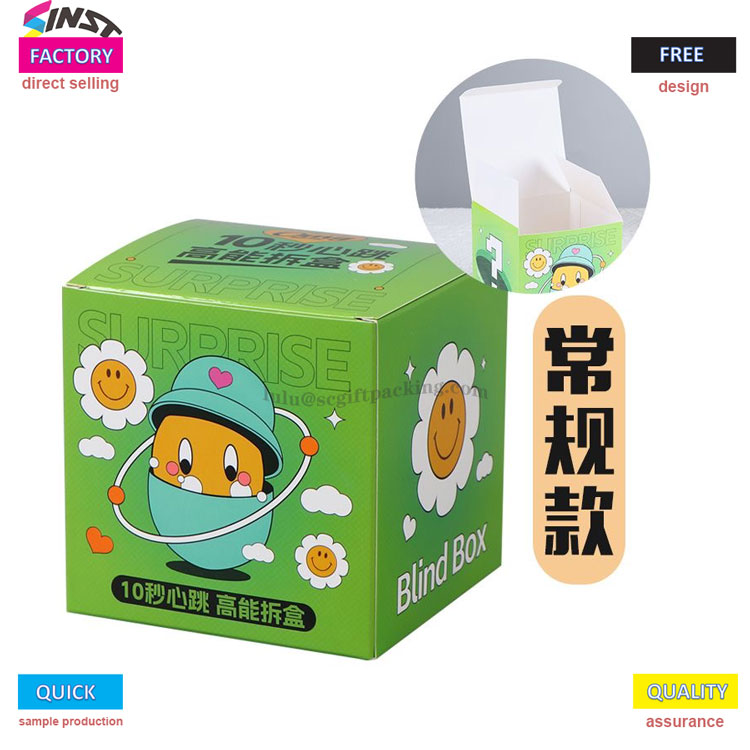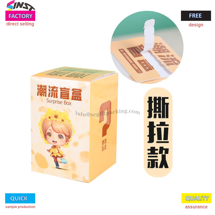 Velikost Trendy Doll Blind Box Off Off Off Card je mogoče prilagoditi glede na potrebe strank. Trenutno so velikosti polja: 6 * 6 * 10cm; 10 * 10 * 15cm; To polje lahko uporablja tiskanje z visoko ločljivostjo in uvoženo črnilo,